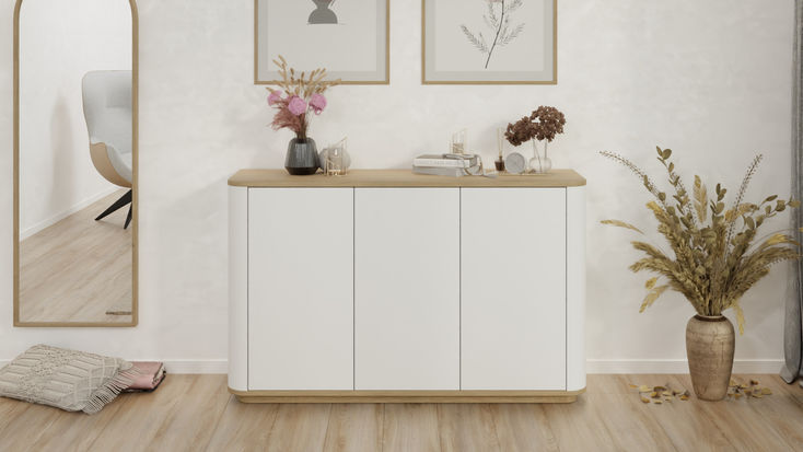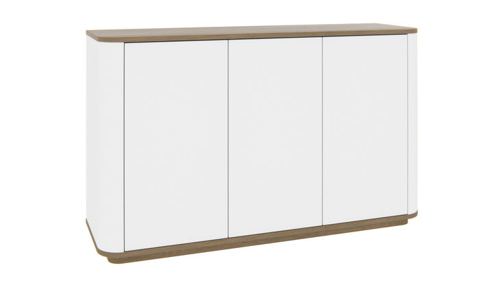 Moderní komoda v praktickém dvířkovém provedení. Kombinace dřevodekoru a lakovaných ploch.