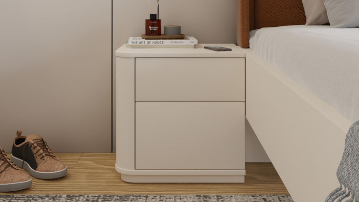 Lakovaný noční stolek s elegantním zaobleným bokem. Moderní bezúchytkové otevírání zásuvek.